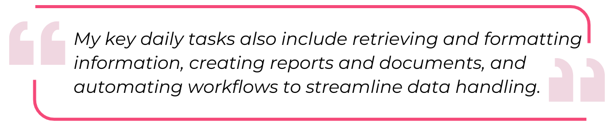 Typical day involves verifying, and validating data in databases or spreadsheets, cleaning large datasets, identifying and correcting errors, and generating reports to ensure data accuracy and integrity. Working with software tools to organize and process information, often collaborating with other team members to clarify data requirements and resolve issues.